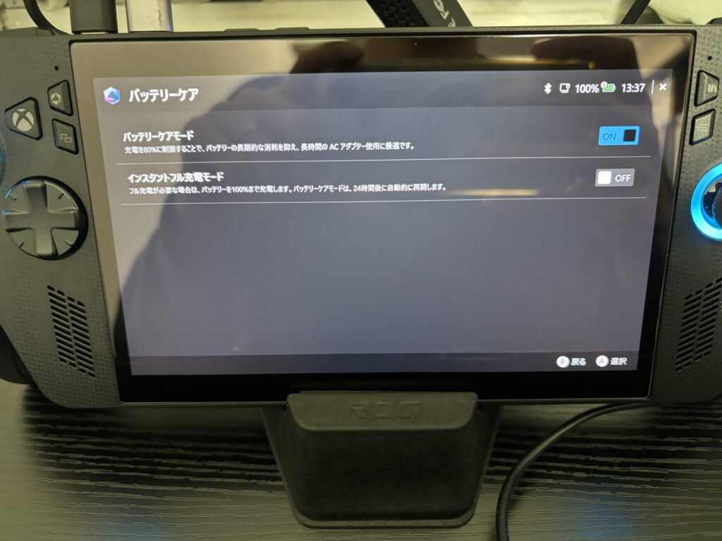 初期状態だとフル充電可能になっているので、バッテリーの劣化を防ぐために、80%充電設定をした方がいいかと思います。