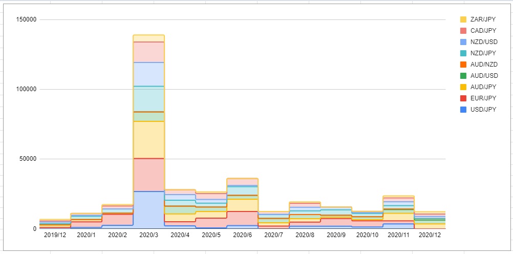 いつも通り、AUD/JPYが頑張って稼いでくれましたが、それでも毎月よりは少ない。。。